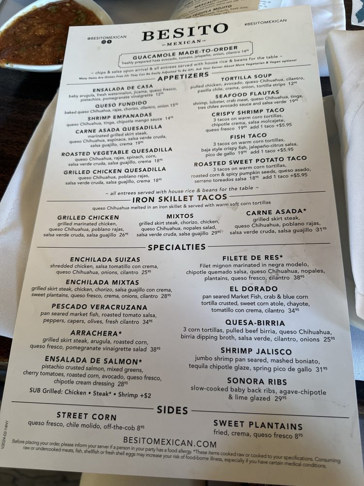 “ My partner and I went to Besito for a Valentine's Day dinner. We had reservations and were seated after only a few minutes of waiting. We got an excellent table in the back corner. I ordered a blood orange and passion fruit margarita over the course of the night-both were good but not very strong. The guac was brought over to our table made already-likely because how busy the evening was. Definitely order at least a medium otherwise it's pretty bland. Tortilla chips were salty but not warm and the salsa was nice and thick. I had the sweet potato tacos and they were delicious. A bit on the small side but with all the apps and sides we ordered it was the perfect amount. My boyfriend got the special (~50 dollars) for a nice cut of steak, shrimp, asparagus, and potato's. Everything was good but I wish it all had a little more spice. The fried ice cream was a fun treat at the end of dinner. Service was great, our server was attentive and the bussers were on it. Overall a really nice date spot. ”
